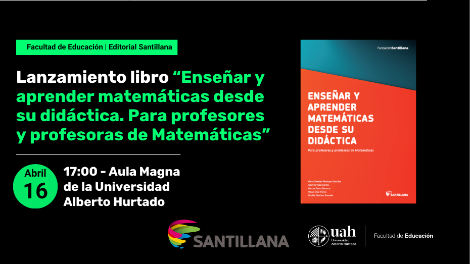 La Facultad de Educación UAH junto con la Editorial Santillana te invitan a participar en el lanzamiento del libro “Enseñar y aprender matemáticas desde su didáctica. Para profesores y profesoras de Matemáticas”.