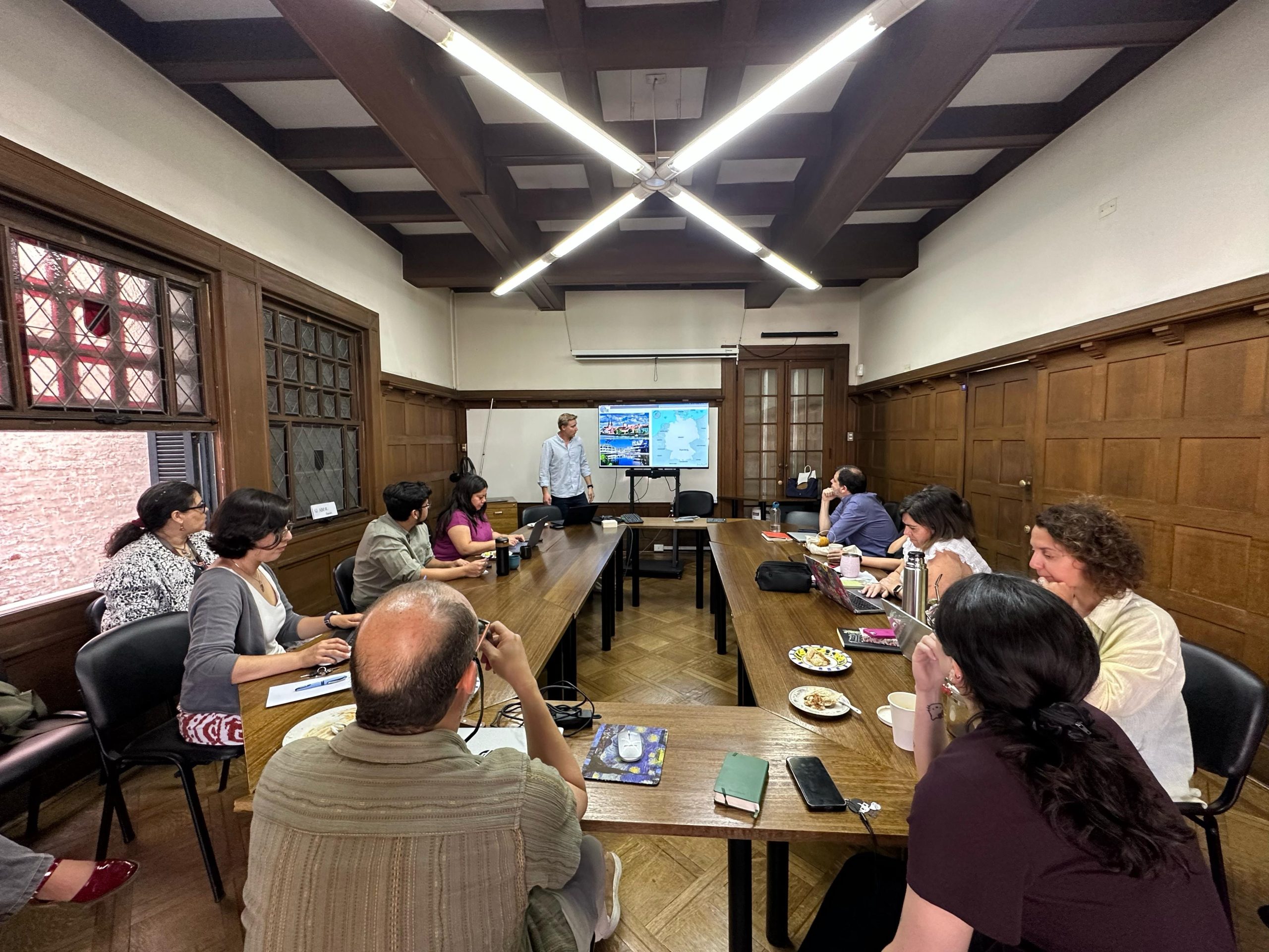 El investigador realizó una presentación de su proyecto centrado en el estudio de los valores laborales de la Generación Z —personas nacidas aproximadamente entre 1997 y 2012— y su relación con los valores corporativos de empresas multinacionales. La investigación trata de comprender cómo estas nuevas generaciones se integran al mundo del trabajo y qué tensiones o coincidencias existen en un escenario marcado por la globalización.