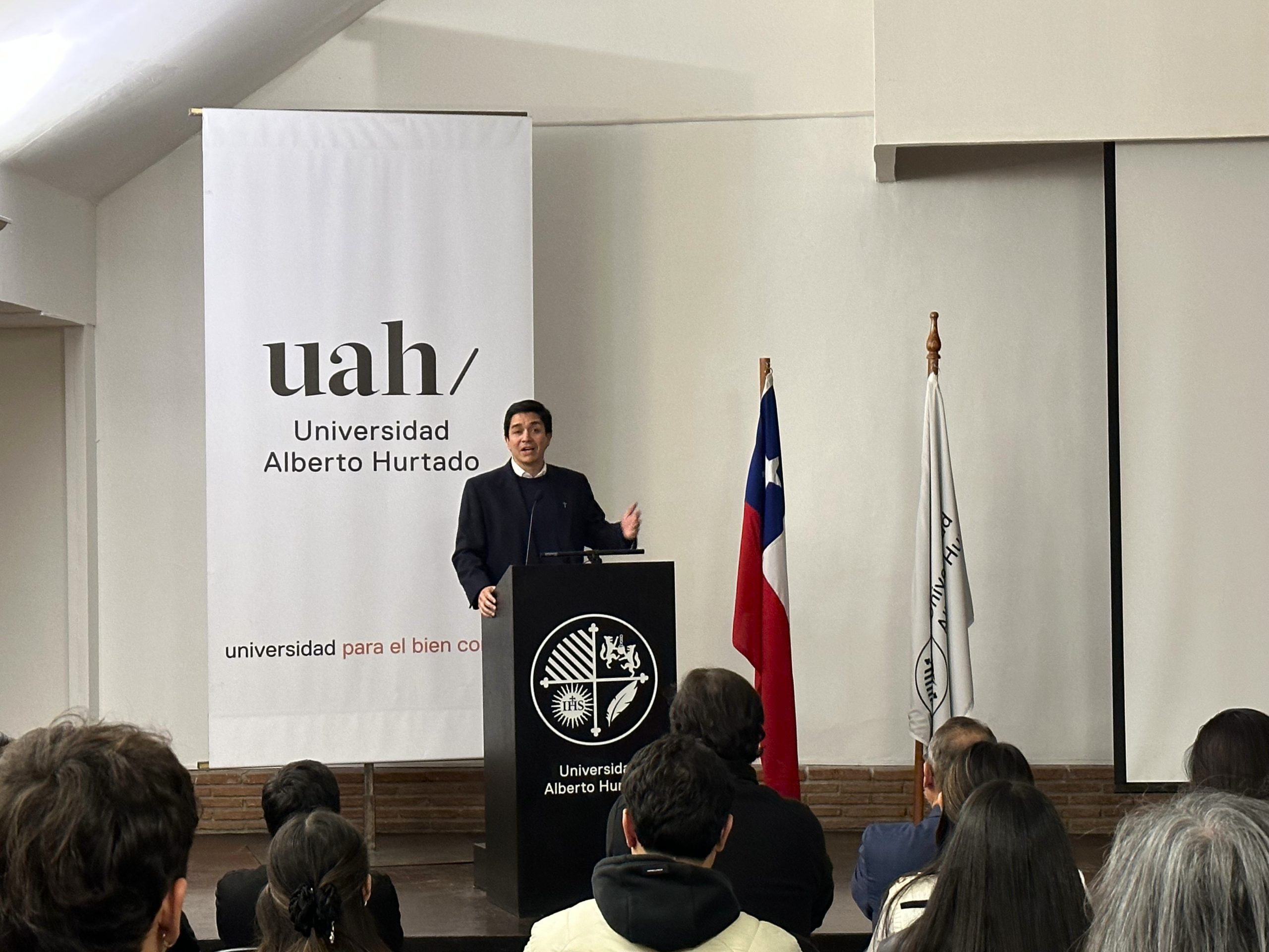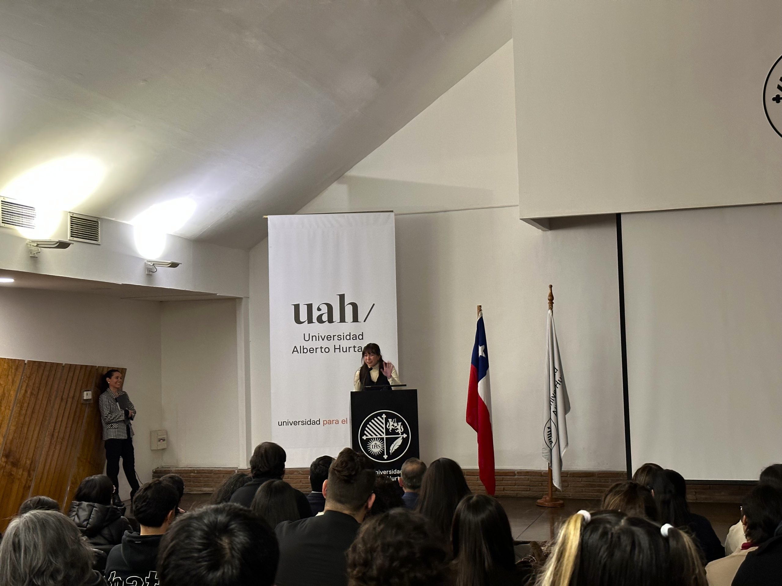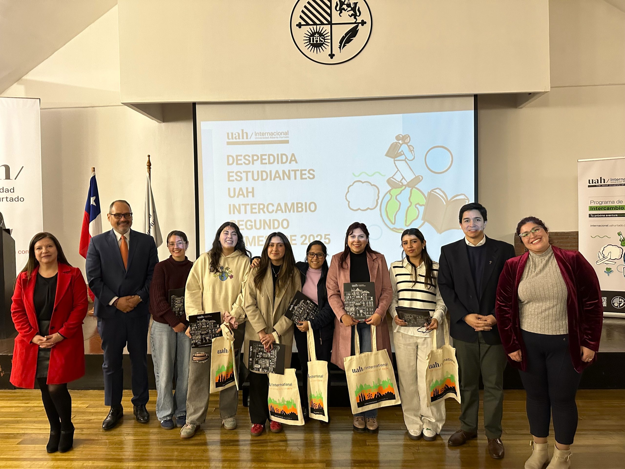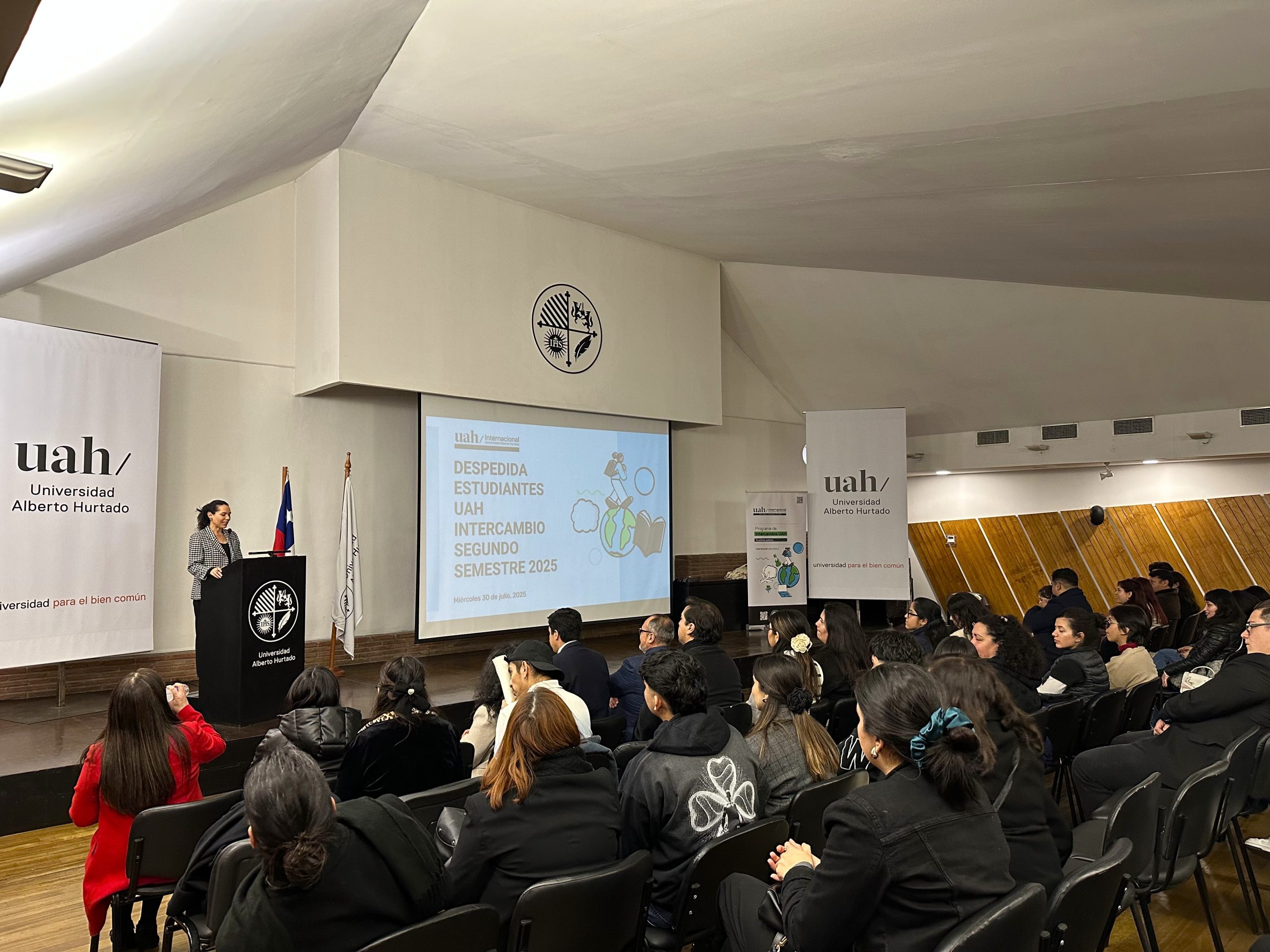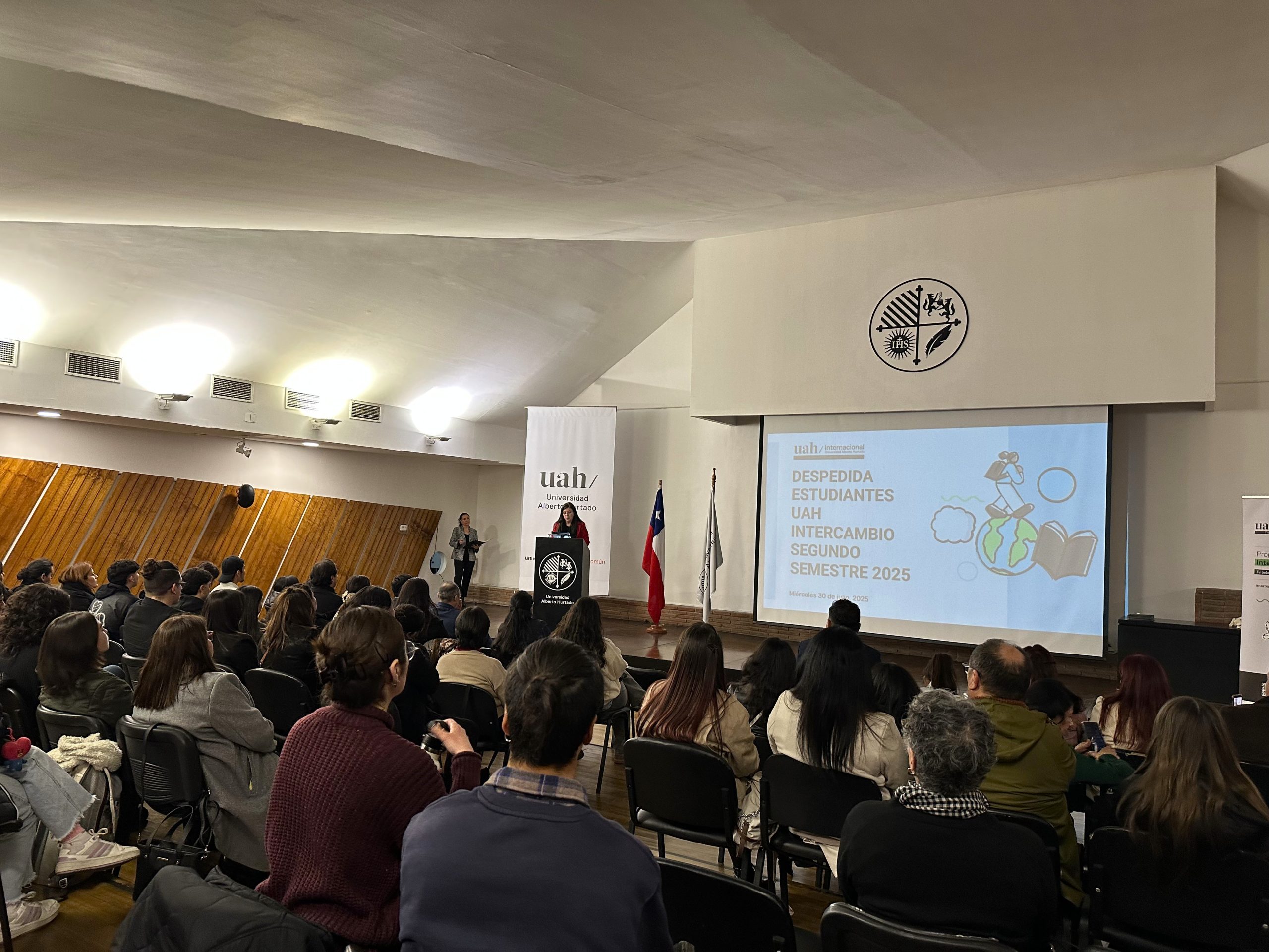 En una emotiva ceremonia realizada el pasado miércoles 30 de julio, la Universidad Alberto Hurtado despidió a 27 estudiantes que partirán de intercambio académico a diversas universidades extranjeras durante el segundo semestre de 2025. El encuentro se desarrolló en el Aula Magna de nuestro Campus Patrimonial y contó con la participación de autoridades universitarias, académicas, académicos, familiares y amistades de las y los estudiantes seleccionados.