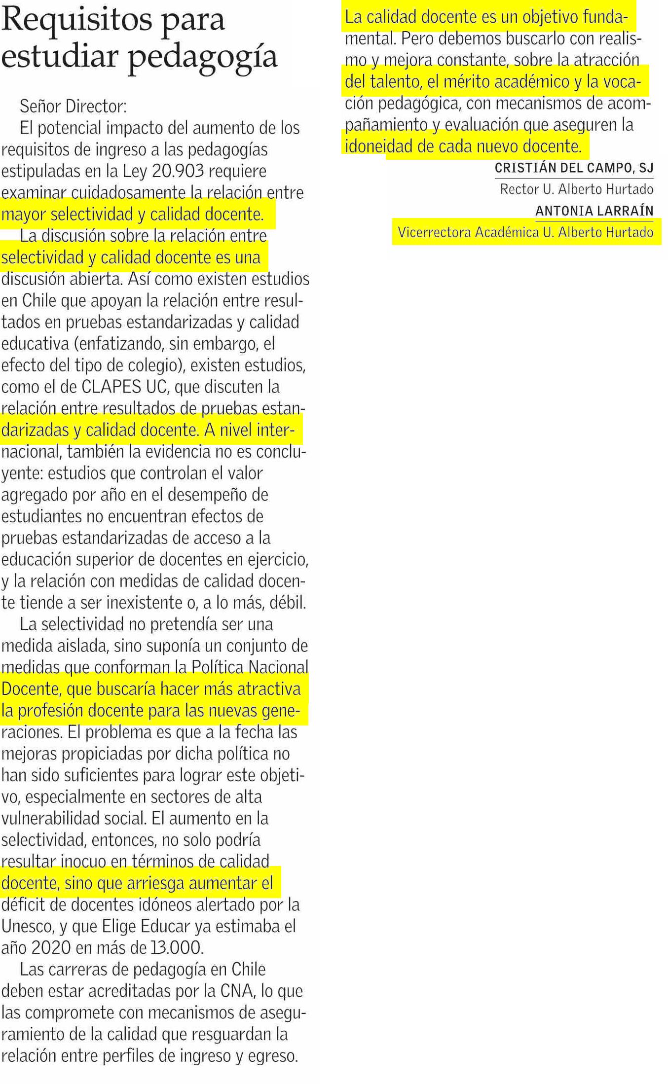 Señor Director: El potencial impacto del aumento de los requisitos de ingreso a las pedagogías estipuladas en la Ley 20.903 requiere examinar cuidadosamente la relación entre mayor selectividad y calidad docente.