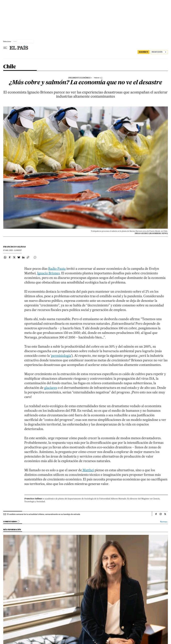 Tras este llamado a subir la productividad del cobre en un 50% y del salmón en un 200%, su discurso engancha con proposiciones sobre reducir la burocracia ambiental para lograrlo (más conocido como la ‘permisiología’). Al respecto, me surge la siguiente pregunta: ¿será la industria extractiva donde tenemos que establecer nuestras metas de crecimiento? Briones parece no ver las experiencias desastrosas que acompañan el acelerar estas industrias altamente contaminantes.