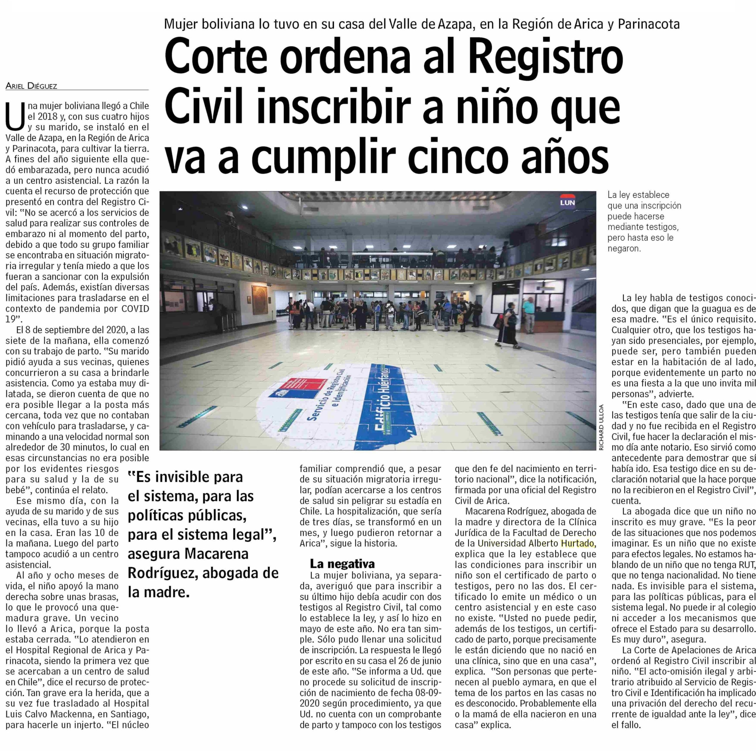 La respuesta le llegó por escrito en su casa el 26 de junio de este año. “Se informa a Ud. que no procede su solicitud de inscripción de nacimiento de fecha 08-092020 según procedimiento, ya que Ud. no cuenta con un comprobante de parto y tampoco con los testigos de parto y tampoco con los testigos que den fe del nacimiento en territorio nacional”, dice la notificación, firmada por una oficial del Registro Civil de Arica.